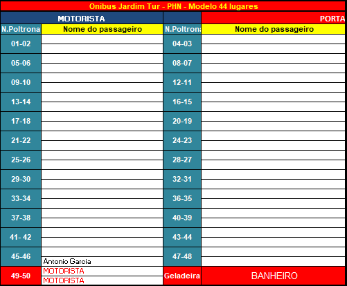 ATENÇÃO! Você já poderá reservar sua vaga, uma vez que a colocação se dá por ordem de chegada! Portanto, ao reservar sua vaga, poderá escolher a poltrona de sua preferência!) Exceto as 4 poltronas da frente! Essas estarão reservadas para mães com criança de colo!